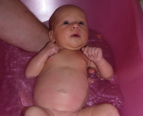 Úgy érzem mintha a magzatvizet idézné vissza neki a rugalmas közeg. Először csak beleültetem a jó meleg vízbe, aztán az egész testét belemerítem. Nagyon élvezi már most is a pancsolást, a lényeg, hogy biztonságosan fogja az ember. Egy kicsit hagyom lubickolni, aztán megmosdatom fürdőkrémmel főleg a hajlatoknál. A születési haja lassan kezd kihullani, már csak hátul van, amitől egy kicsit kopaszka lett, de már nő az új haja.