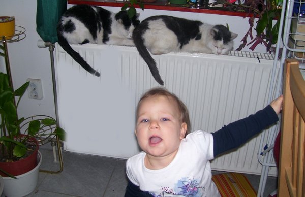 A cicákat ebben a nagy hidegben beengedtem, te meg kihasználod az alkalmat és nyúzod őket tovább, húzod a farkukat, vakarod a hátukat és emelgetve cipeled őket. Lizi ezt nehezen tűri, ezért tele vagy karmolással.