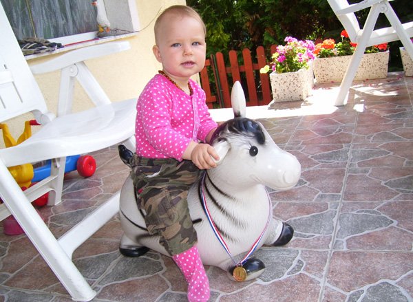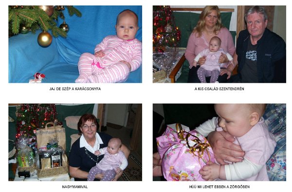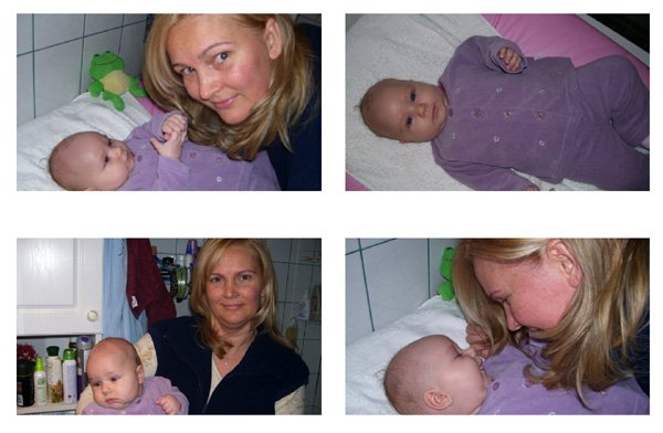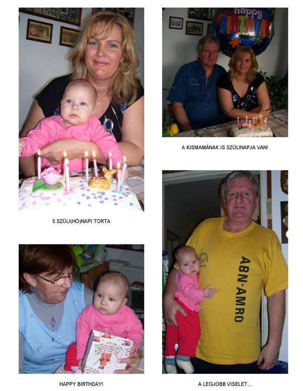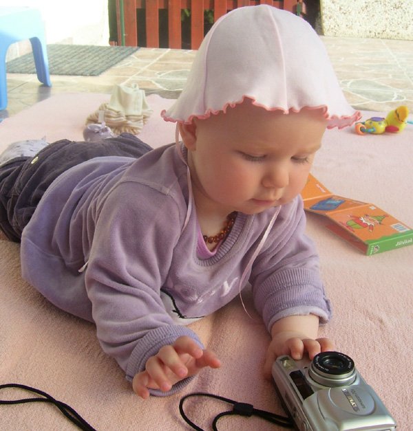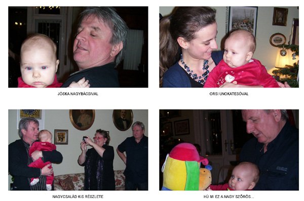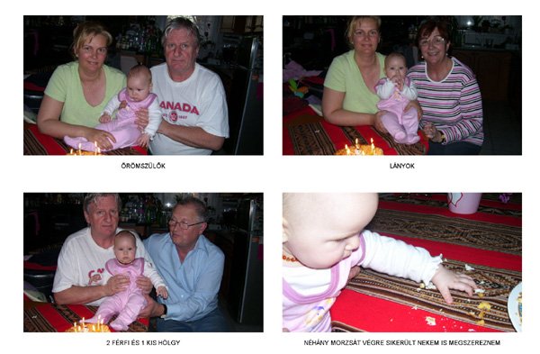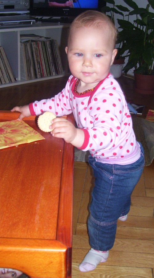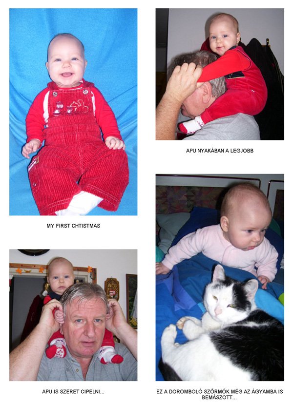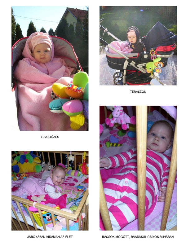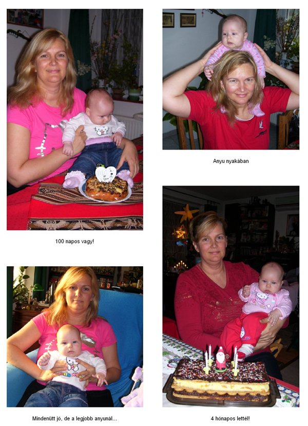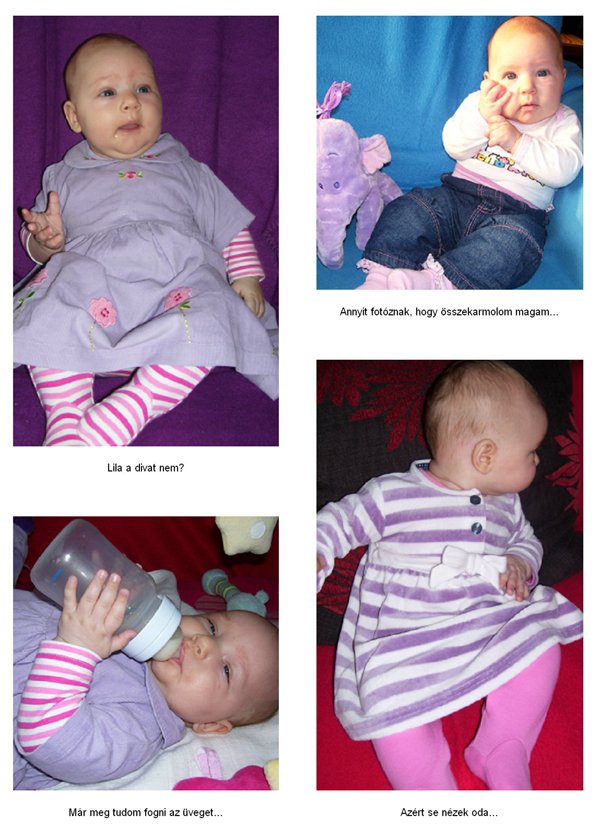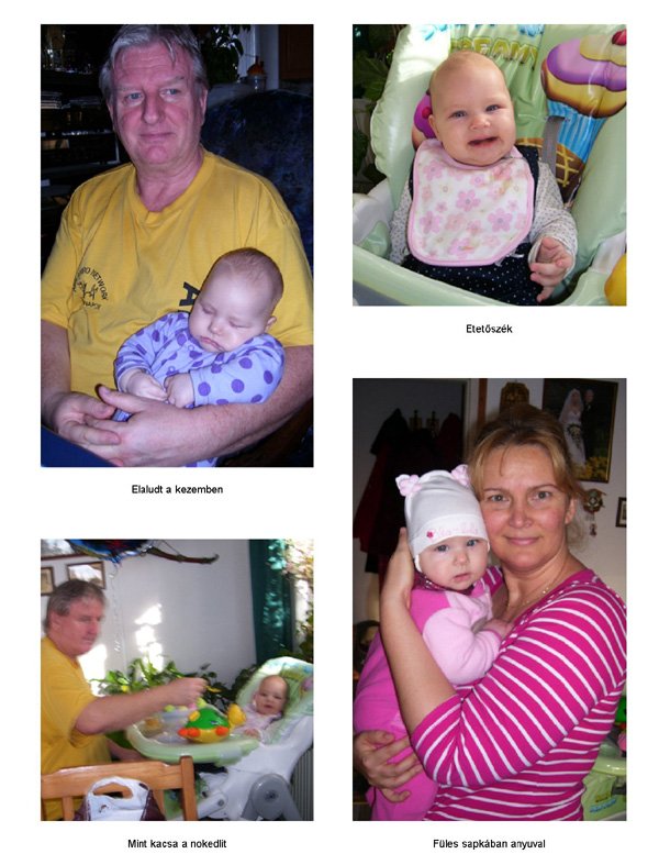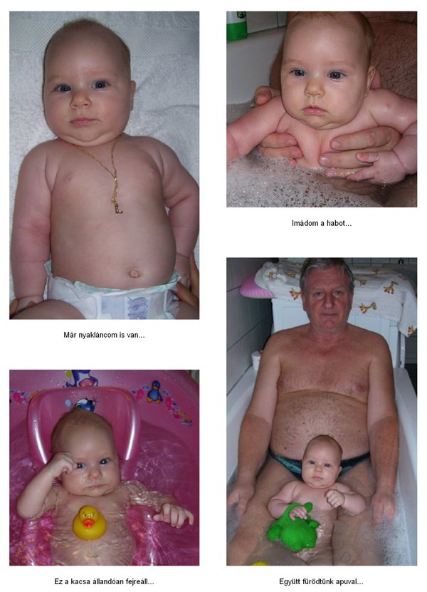 Egy időben már különböző dolgokra tudod használni a két kezed: kapaszkodsz és játszol egyszerre. Nagyon jó az utánzóképességed is, amit megmutatunk, elismétled. Szerintem már majdnem mindent megértesz és bizonyos dolgokban nagyon szófogadó vagy: ha fürdőkádban azt mondom – csüccs – azonnal leülsz, de mikor a virágföldet kaparod ki a cserépből, hiába mondom, hogy – nem szabad – csak csinálod ugyanúgy tovább. Mindenesetre tudod, mikor rosszalkodsz, mert akkor rám nézel, – szabad e? De tiltásom ellenére, azért nyugodtan csinálod tovább…