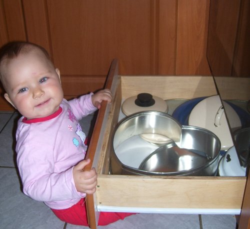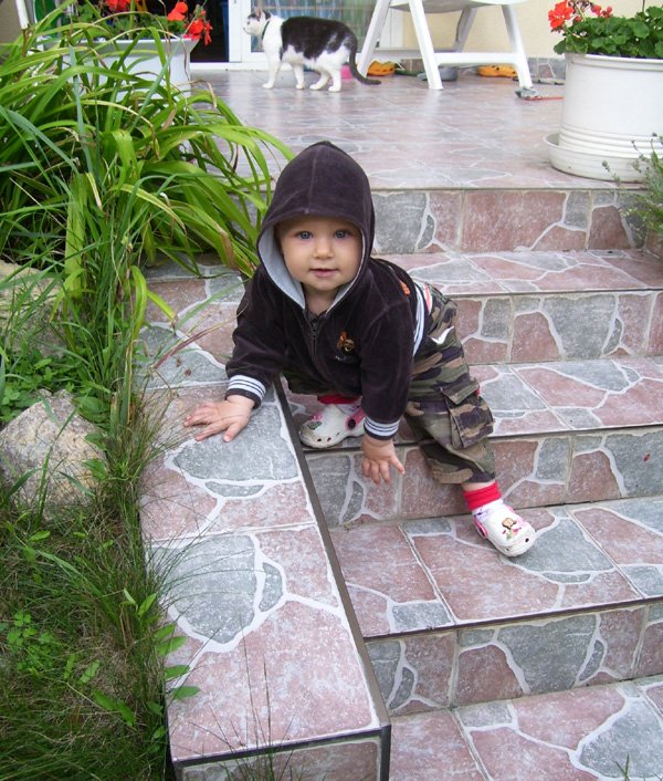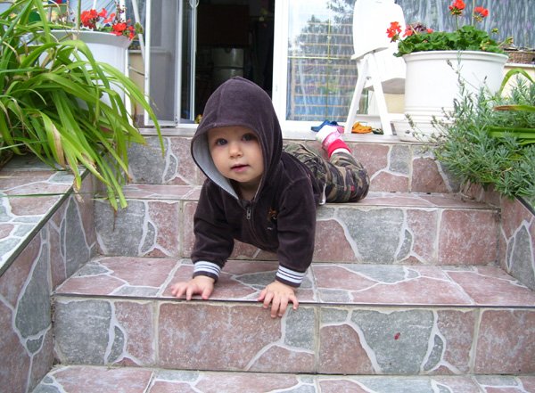 Villámgyorsan skerázol a macskák után, és speciális technikával megtanultál a lépcsőn lefelé is mászni. De nem úgy, ahogy tanítottalak, hátrafelé letéve a lábad – hanem fejjel előre, először a kezedet teszed le, és hason csúszva lemászol…Végül is, így is le lehet jutni…