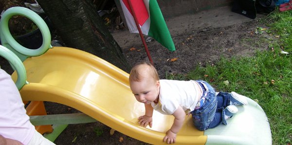 Mivel semmi sem használt, időnként kijöttem-visszamentem, ki bírja tovább. Éppen a nappaliban voltam, és már örülni kezdtem, mert mintha enyhült volna a sírás. – A következő pillanatban megjelentél a babaszoba ajtajában, hálózsákban, a földön mászva… Hogyan sikerült a gyerekágyból kimásznod, az rejtély… Lehet, hogy a babaágyban lévő szopipárnára állva? Vagy az ágy melletti ringató fotelba mászva? Soha nem tudjuk meg. Az biztos, hogy nem ütötted meg magad, mert nem hallottunk esést, és nem volt rajtad semmilyen sérülés. Mire nem képes egy kisgyerek, hogy ne kelljen aludnia és minél közelebb legyen az anyukájához… Mindenesetre még akkor éjjel átszereltem a kiságyat a legalsó fokozatra, nehogy éjszaka megjelenj a hálószobánkban…