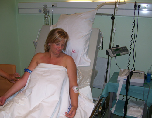 A szülőszobán egy félig ülő ágyon vért vesznek, bekötik az infúziót, amiben antibiotikumot is adnak.