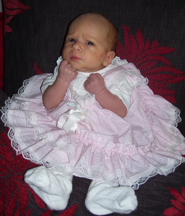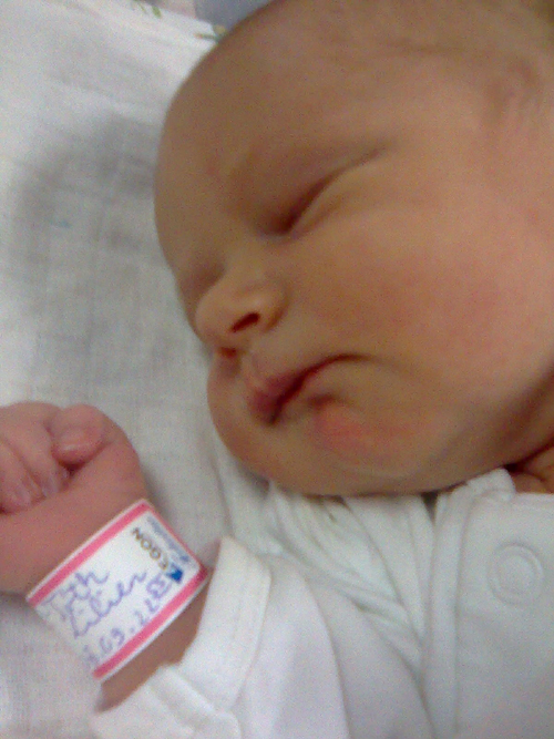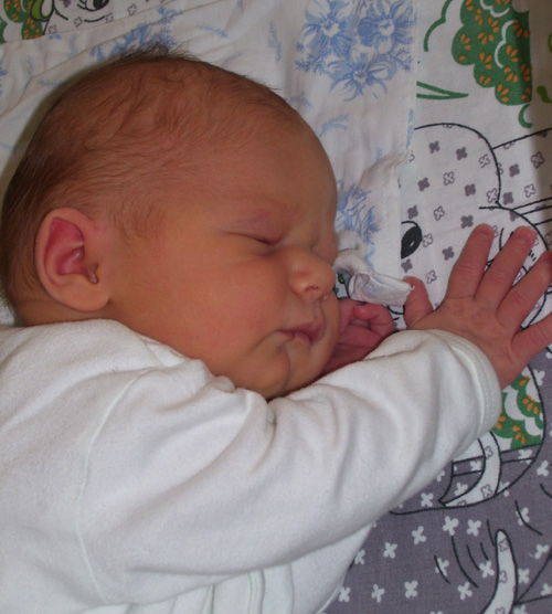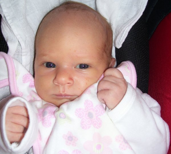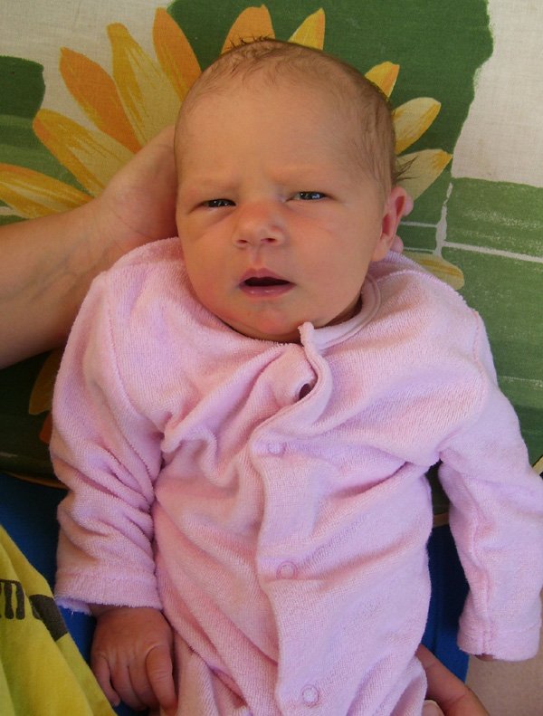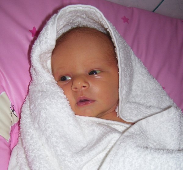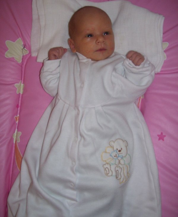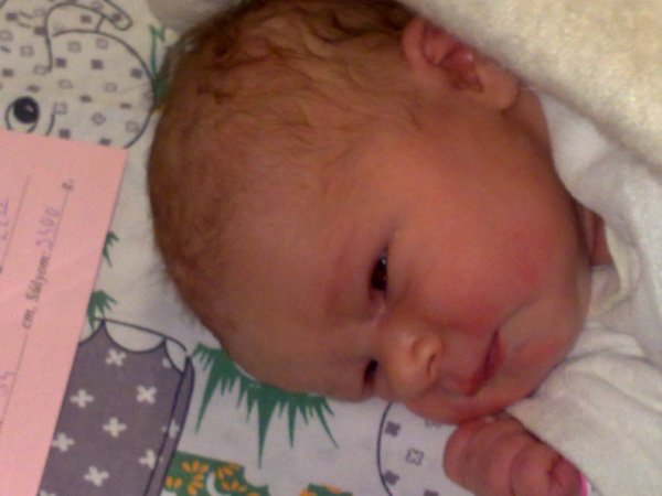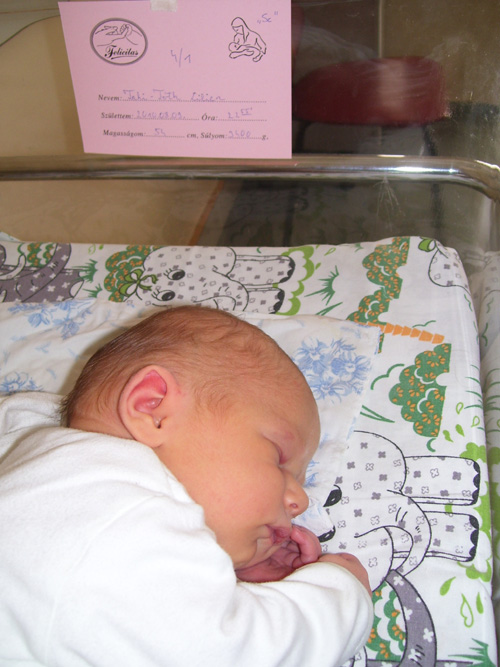 Íme Lilike 17 órás fényképe. Már egészen szép, nem? Hálistennek van tej is, szépen szopizik, sőt tegnap az egész éjszakát átaludta. Este cicizett, meg reggel. Andi inkább maga mellett tartja az ágyban, mert a tolókából ágyban fekve nehéz kivenni. Így legalább megvan az eddig megszokott meleg testkontaktus is. Most is mindig az arca előtt tartja a kezeit, ahogy az ultrahangon láttuk, és ma megkapta az első oltást (BCG) is.