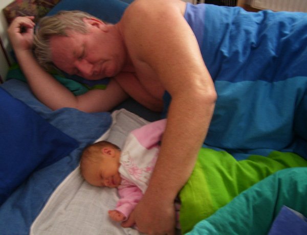 Lilike eddig nagyon jó kislány volt, majdnem átaludta az egész éjszakákat, néha még a nappalokat is, – de most az utóbbi időben egy kicsit többet sír. Egyelőre velünk alszik, mert ez így mindenkinek jó: ha éjjel megéhezik, Andi ott az ágyban, fekve megszoptatja, – én alig veszek észre valamit, ugyanúgy alszom, mint eddig. Andinak is kényelmesebb, mintha mindig a másik szobába kellene átmennie éjszaka szoptatni, mert itt csak oldalra fordul, amikor Lili szopni akar. (Már azt is észrevettem, hogy néha szegény Andi szoptatás közben is bealszik.) Lilinek is ez a legjobb, mert így közel érzi anyukáját és a betevőt. A szoptatás a baba minden igényét kielégíti: nemcsak a táplálékot, hanem az ebben a korban létfontosságú testi közelséget és ezzel a megnyugtatást is.
