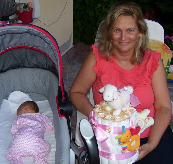 Mms kép a tolókában fekvő Liliről: „Alszik és mosolyog.”